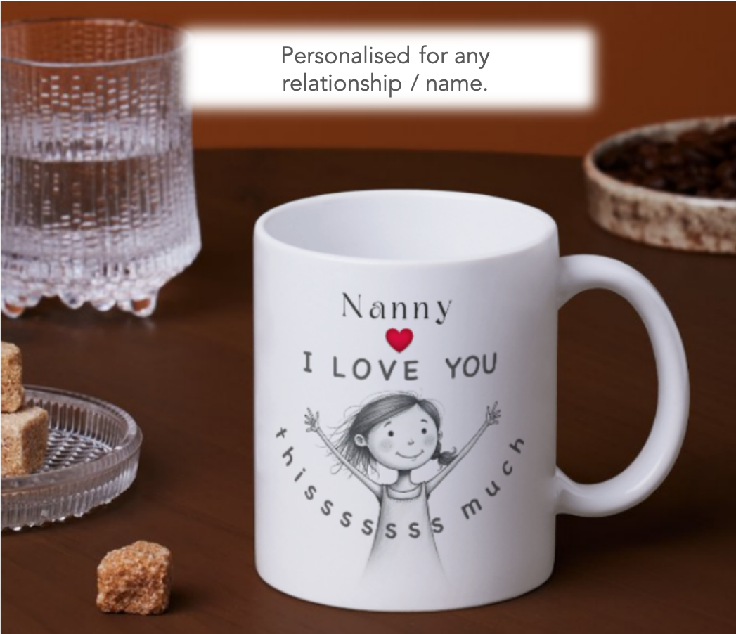 Make Nanny, Nan, Granny, Grandma, smile with this adorable mug that shows just how much she’s loved – thisssssss much!