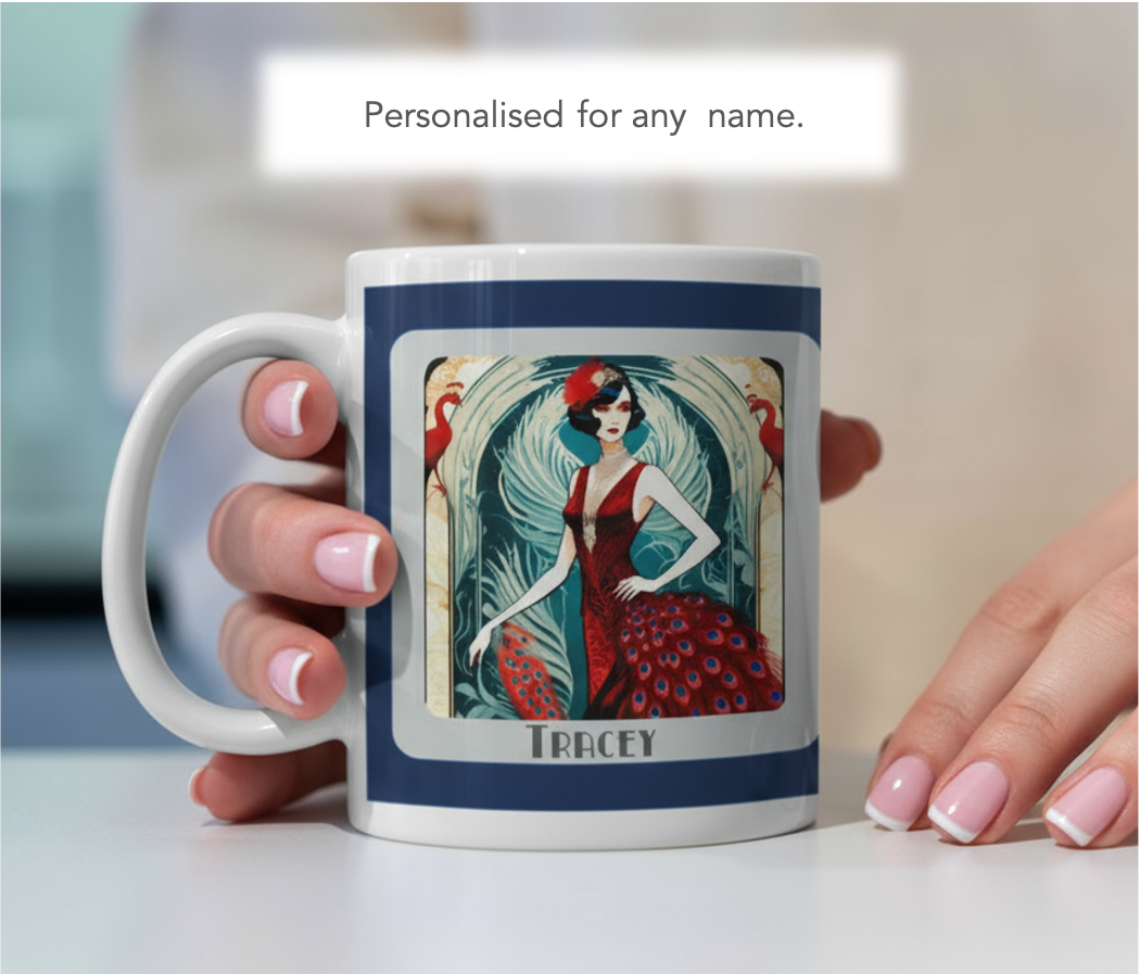 This Art Deco-inspired mug features a poised 1920s lady in a dramatic red gown, with stunning peacock feather details and ornate flourishes in the background. Framed with deep navy and silvery-grey tones, it’s a bold, luxurious design perfect for stylish women of any age.