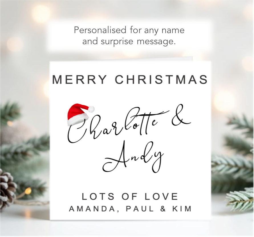 Embrace the Xmas spirit with our charming Personalised Scroll Style Text Christmas Card! This elegant card features beautifully designed scroll-style text displaying the recipient's name, such as Mum & Dad, and allows you to add your own name as the sender. The classic design adds a touch of sophistication to your festive greetings, making it perfect for families and loved ones, making it a fantastic keepsake.