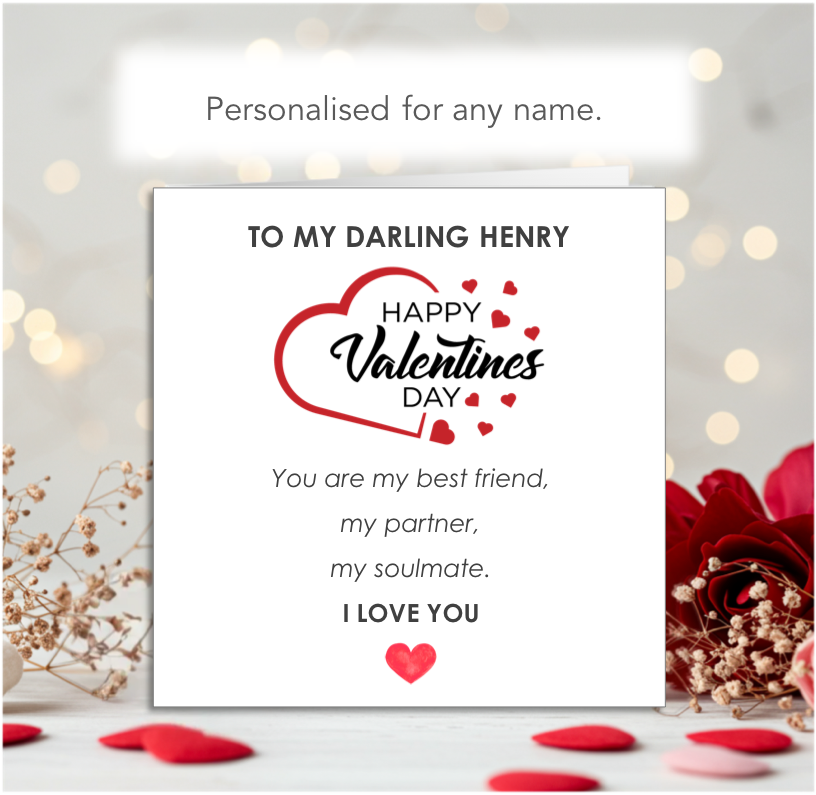 Express your deepest feelings with a personalised Valentine’s Day card featuring a stylish and simplistic text design that reads: "You are my best friend, my partner, my soulmate. I love you." Perfect for sharing your love and appreciation with your soulmate.